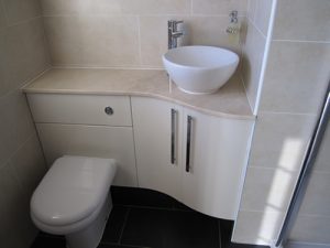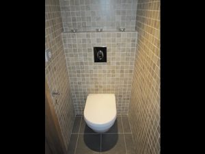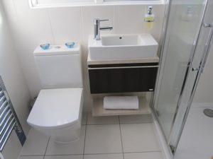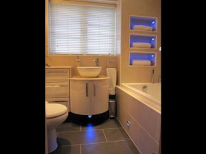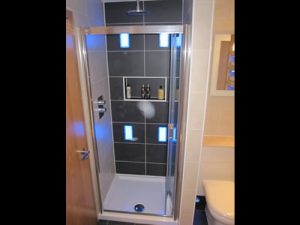 The sanitary ware was supplied by Villeroy & Boch, Rocha and Matki, featuring lighted niches within the tiled walls.